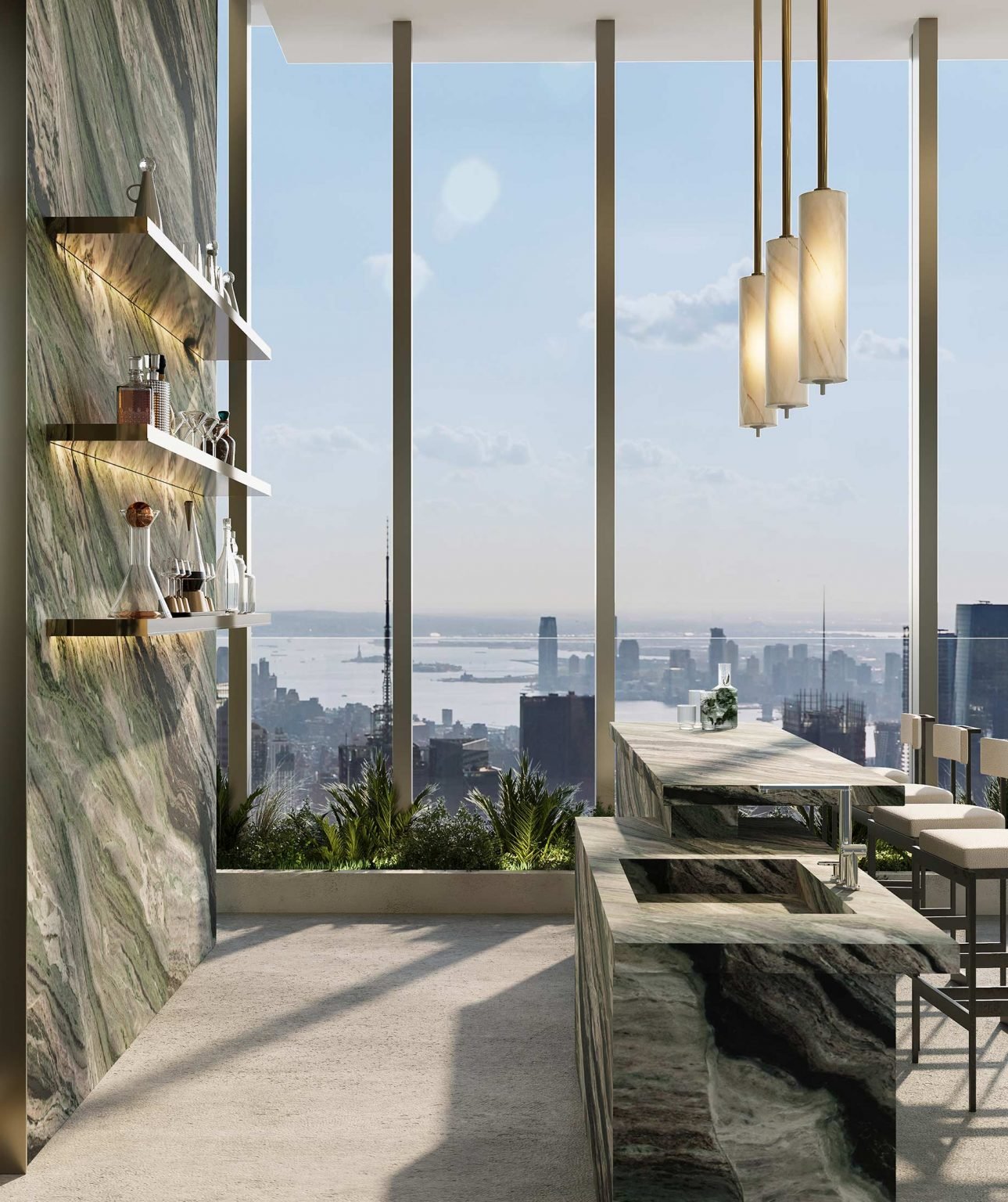 The sky garden’s private chef table at 111 West 57th Street is a striking example of culinary excellence, blending impeccable design with breathtaking views to elevate the fine dining experience in New York City. The table, crafted from luxurious Italian marble, embodies sophistication, enhancing the ambiance of the space.