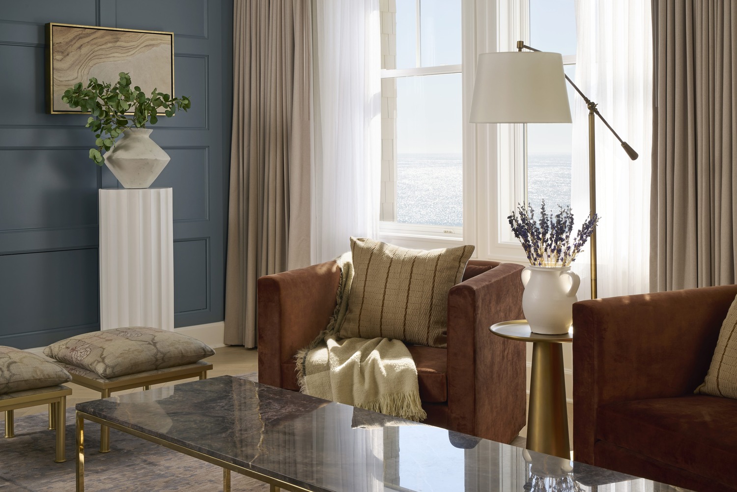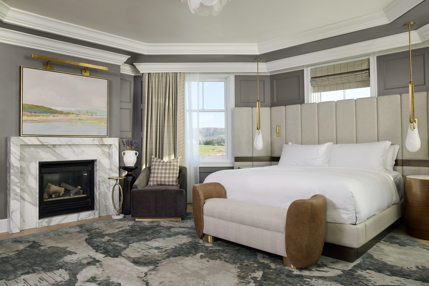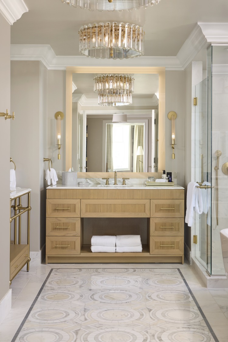 The redesign of The Ritz-Carlton draws inspiration from Northern California’s coastline and forests, creating a sophisticated, tactile experience. Guest rooms and suites reflect the landscape’s muted hues, with textured fabrics and warm leather accents, together with custom cabinetry and polished marble surfaces. In public spaces, modern plaid accents evoke comfort and history, inspired by Scottish traditions. Throughout, the design integrates natural elements with heritage.